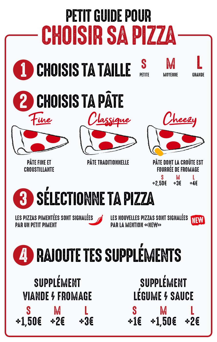 Sauce tomate, fromage, jambon*, merguez, lardons*, champignons, oignons